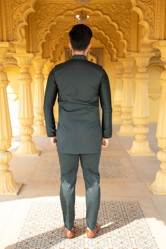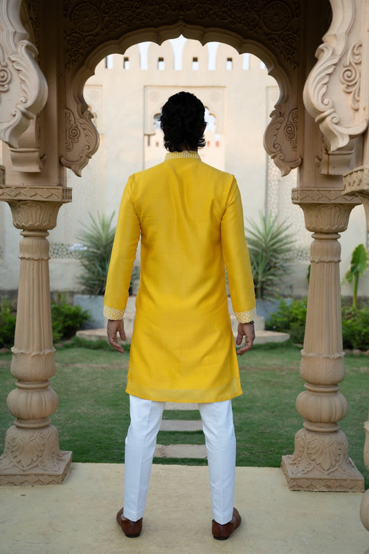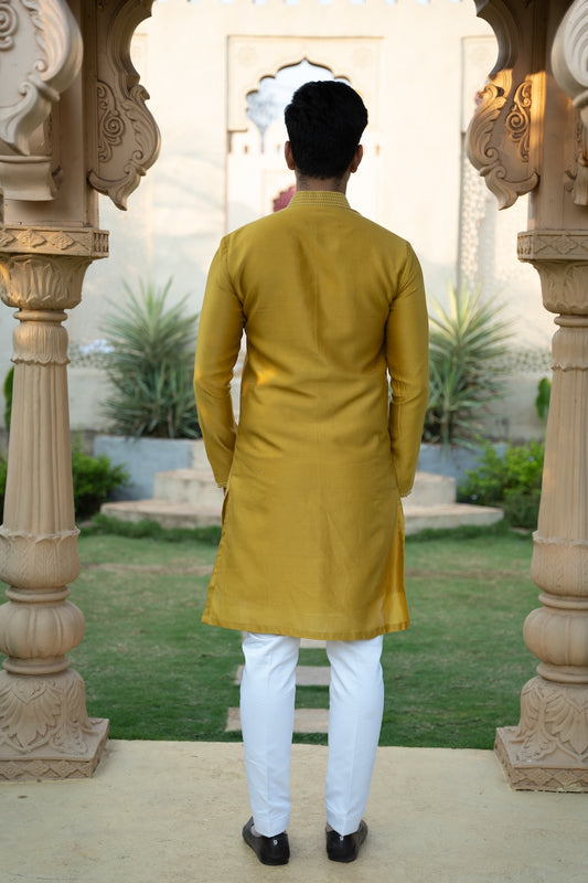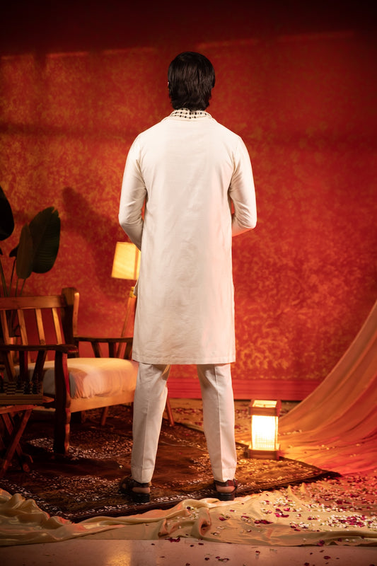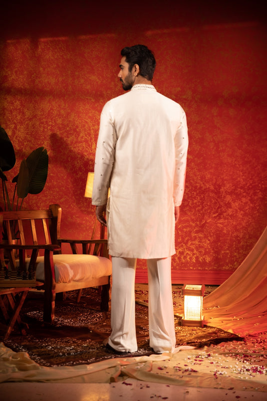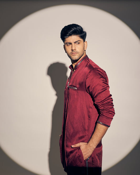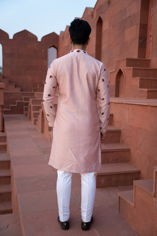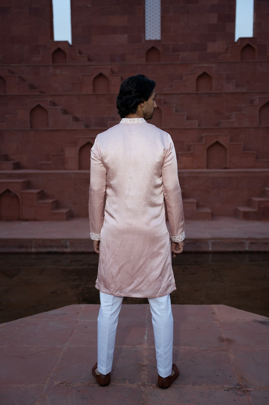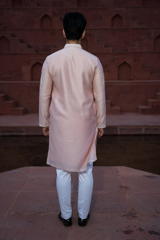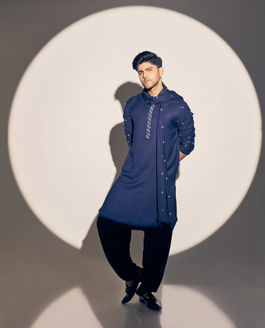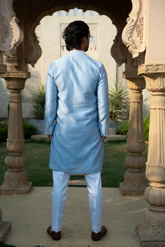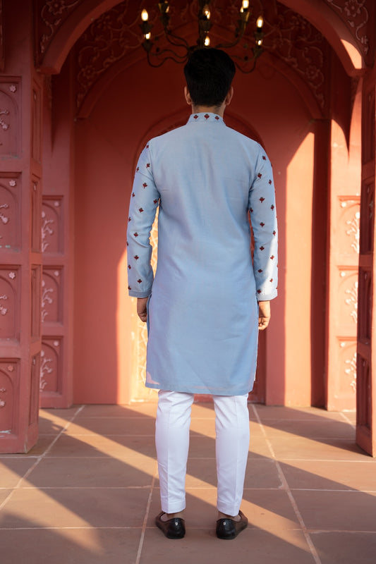Ice Blue Satin Linen Shoulder Stripe Kurta Set